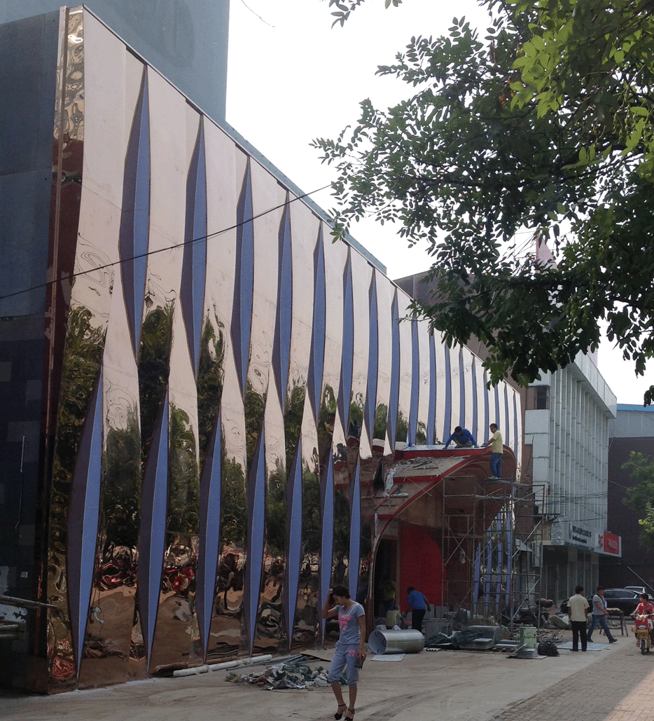 例如:歡樂谷KTV外觀,因為技術(shù)遠(yuǎn)跟不上,我只能設(shè)計了個相對簡單的,他們卻也沒法下手,還和施工人員講解并‘通過’了三次,最終因技術(shù)利益關(guān)系,外包的焊工,卻沒有得到這些技術(shù)指導(dǎo),可能是接這東西時,夸下?谡f會做,最終施工員沒轉(zhuǎn)教他,后來我只再次現(xiàn)場指導(dǎo)工人如何簡單制作,并快束簡單就解決了完成了,最后設(shè)計指明材料,卻換了我也不敢說可以保證的;如圖: