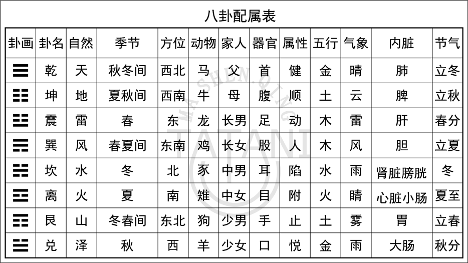 八卦 《大游年歌》(這個(gè)千萬(wàn)別死記,是寫(xiě)復(fù)雜、弄亂順序用來(lái)顯示高深的騙人的,記‘游年六字訣’可以了,除非你喜歡唱這類歌;),《大游年歌》如下: 乾:六天五禍絕延生 坤:天延絕生禍五六 震:延生禍絕五天六 巽:天五六禍生絕延 坎:五天生延絕禍六 離:六五絕延禍生天 艮:六絕禍生延天五 兌:生禍延絕六五天 八卦 游年六字訣:“生絕禍,五六天;” 全句是:‘伏生絕禍,延五六天;’但沒(méi)有人這樣讀,原口訣的解釋是:兩卦不變是伏位(伏位)都是那個(gè)位置,可以不理;上變生氣,中變絕命,下變禍害;全變延年(全變不用記);后句:上中變五鬼,上下變六煞,中下變天醫(yī); 口訣如何用:下面給你舉個(gè)例子,這樣你就明白上圖的吉兇位置,是如何算出來(lái)了;算這個(gè)要用后天(文王)八卦,例如坐北朝南,北方是“伏位”,也是坎位,卦畫(huà)中“斷”為陰爻,后面以“0”代替;“連”為陽(yáng)爻,后面以“1”代替;卦畫(huà)是010,東邊是震位001,與坎卦放到一起,第一個(gè)都是0,第二、第三變了,轉(zhuǎn)過(guò)來(lái)就是中下變了,是“天醫(yī)”;西面為兌卦卦畫(huà)是011,與坎卦010,最后一條變了,西面是“禍害”;東北為乾卦111,與坎卦010,變了第一和第三條,此位是“六煞”! |
