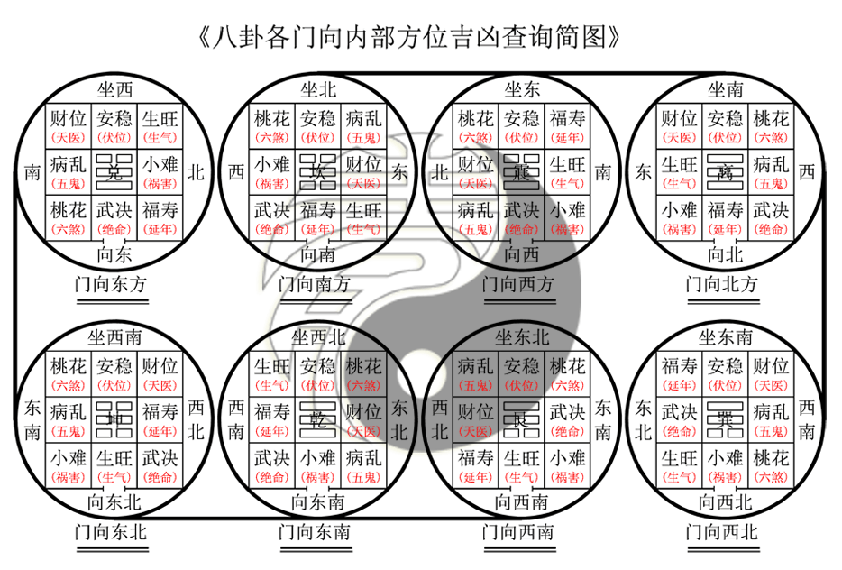 | 關(guān)于八卦中門還有個(gè)歌訣:“東西正門是絕命,南北中前是延年,東北西南迎生氣,西北東南禍害臨!” | |||||||||