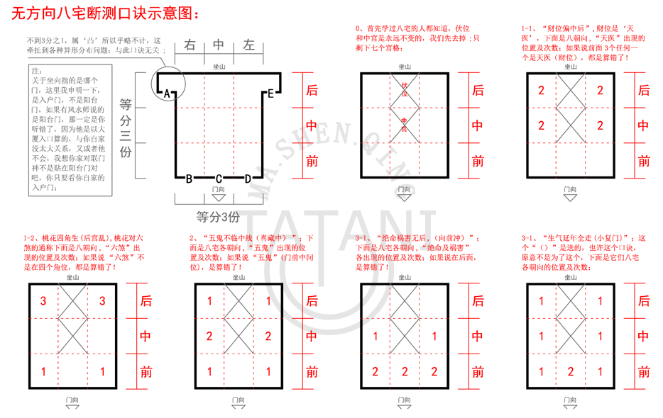 | 無(wú)方向八宅斷測(cè)歌訣:“財(cái)位布中后,四角桃花生(后宮亂);五鬼不臨中門(喜藏中);絕命禍害無(wú)后(向前沖);” | |||||||||