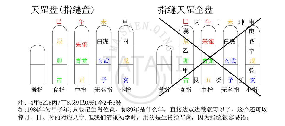 | ·天罡盤算法,主要是對外的,難度很高,全盤對外時有迷惑的作用,事實上只是用上圖的前者(非打叉的),只要用來對應時間去算時辰八字,只要有生日的年、月、日、時或特定那個時間就可以用這個盤算出來,因為算的是指縫很難學,所以用于對外公布,以防止他派快速學到(上圖),個人用的是下圖; |