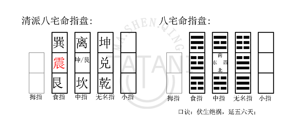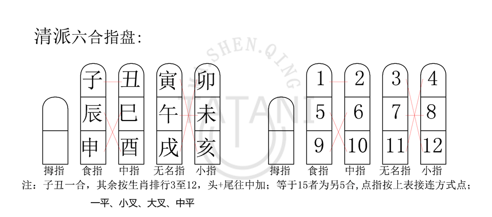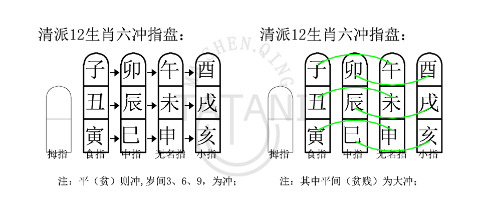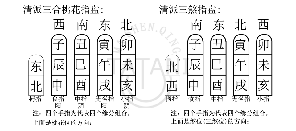 | ·清派生肖盤三合、三煞信息;方向東南西北逆數(shù),結合口訣:“三合東當頭,三煞北當先;”說的是拇指,但算的不是拇子,這樣做也是為了迷惑別的門派; 例如:子辰申三合桃花位在‘正西’,三煞位則在‘正南’; |