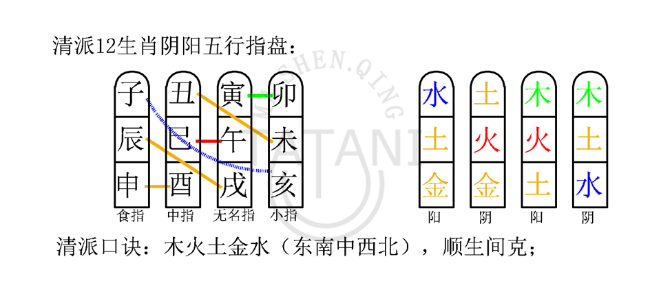 | ·清派生肖盤五行信息;五行的口訣是:木火土金水,順生間克; |
