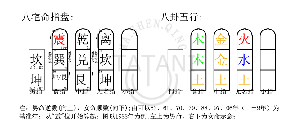 | ·八卦這個算法,只是用于死記,學八卦時,外公曾要初入的徒弟把爻文寫在手上;變換口訣是:‘伏(位)生(氣)絕(命)禍(害),延(年)五(鬼)六(煞)天(乙或醫(yī))’;也就是不變是伏位,上變是生氣,中變是絕命,下變是禍害,全變是延年,上中變是五鬼,上下變是六煞,中下變是天醫(yī);但他對我說的是:“生絕禍五六天”,只是當時我還小也并沒想過學這個;所以我教別人簡單的八卦時,只用這六字訣,主要是不變和全變不用記; |